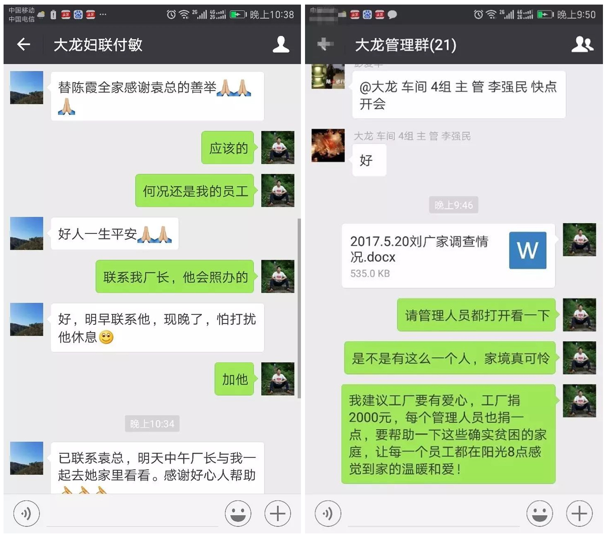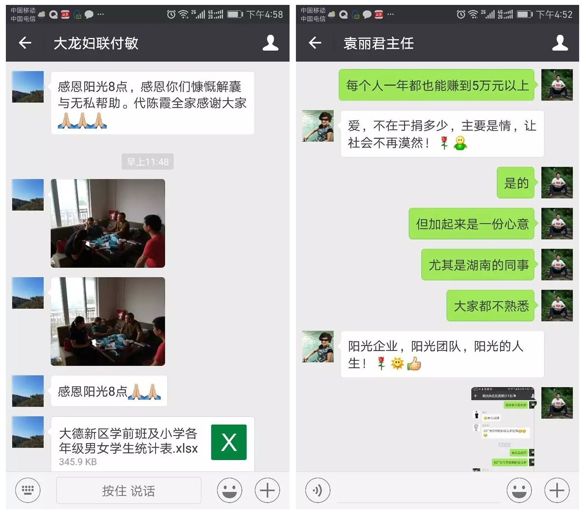 當(dāng)天晚上,在貴州省陽光箱包的袁廠長(zhǎng)走訪完陳霞的家庭并表明情況后,陽光箱包董事長(zhǎng)袁仕偉立即決定,以陽光8點(diǎn)工廠名義向陳霞的家庭捐出2000塊,并號(hào)召貴州省、湖南省、廣州市的陽光8點(diǎn)員工行動(dòng)起來,為自己公司的員工獻(xiàn)一份愛心。活動(dòng)在群里一發(fā)起,很多陽光8點(diǎn)的員工紛紛響應(yīng)號(hào)召。雖然那時(shí)已經(jīng)很晚了,但許多員工依然很熱情地向發(fā)起人奉獻(xiàn)了自己的一份愛心,甚至還有一些做好事不留名的雷鋒同志。520這一天,陽光8點(diǎn)交流群的紅包只有一個(gè)人可以搶~因?yàn)檫@些紅包都是同事們對(duì)陳霞家庭的一份關(guān)愛。每一筆轉(zhuǎn)賬,每一個(gè)紅包,都承載著所有陽光8點(diǎn)員工的善良與愛意,這些愛匯聚在陽光8點(diǎn),又傳達(dá)給需要幫助的同事。