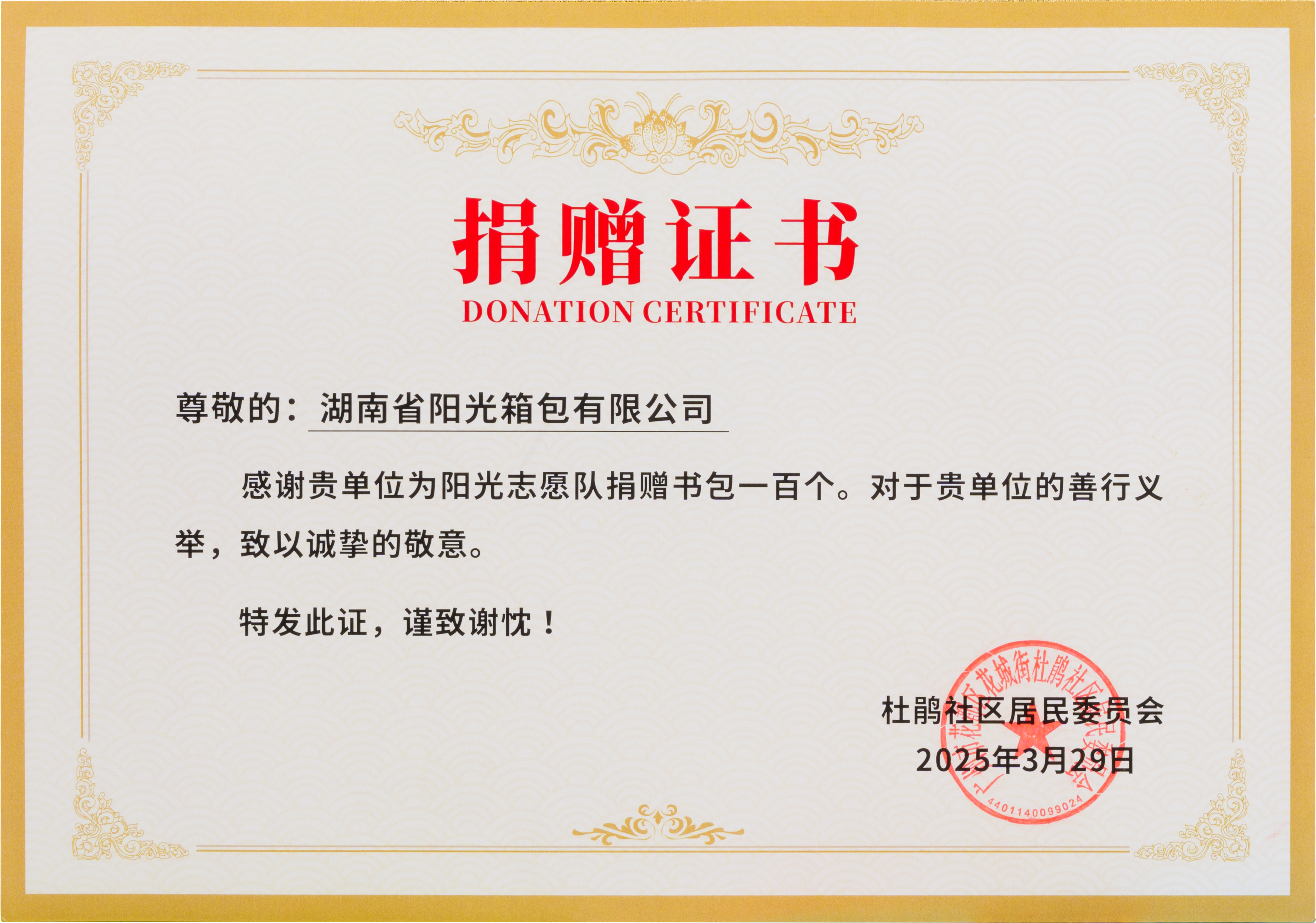 陽光箱包集團榮獲捐贈證書